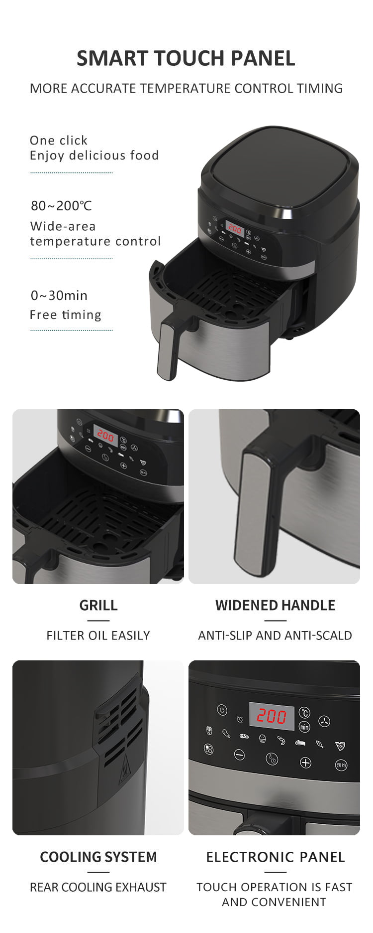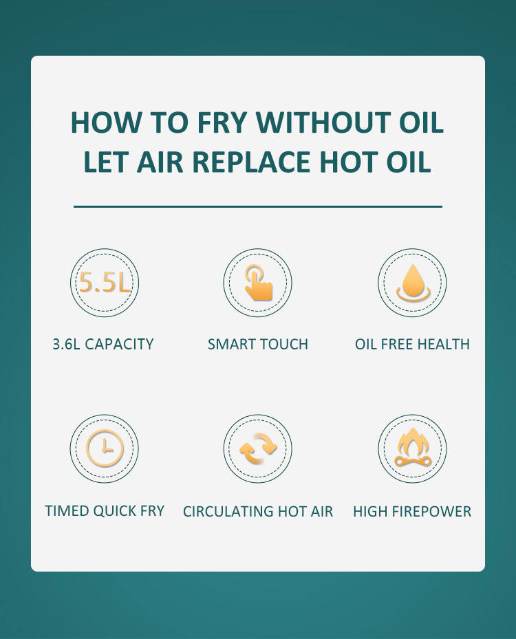 YYZG-550AS, en banbrytande 5.5L pekpanel Digital temperaturtimerstyrning Luft Fryer.Bastning av en digital panel för sömlös och kort drift, prioriterar denna apparat skydd med dess överhettningssäkerhetskarakteristik. Njut av kraften i oupplöst timing, allt från 0 till halvtimme, vilket gör att du kan anpassa bakaktigheter enkelt. Den högkvalitativa matlagningsytan utan stickning säkerställer enkel rengöring, samtidigt som de inbyggda 8 smarta menyerna förenklar operationen. Snabb och till och med varmluftsfördelning kännetecknar sin tillagningsprocess och säljer mer hälsosamma resultat med mycket mindre olja. Den användar-trevliga lådestrukturen förbättrar komforten, underlättar problemfri lastning och lossning av dina föredragna rätter.